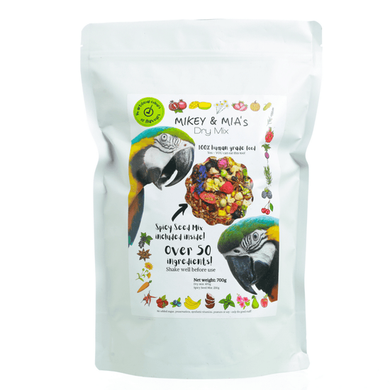 The Mikey and Mia Dry Mix, healthy complete food for small, medium and large parrots.