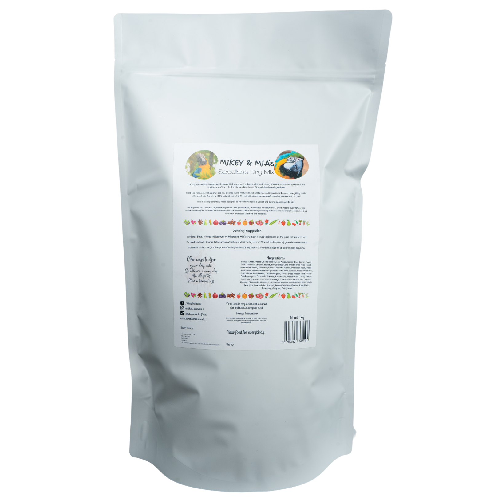 Our usual Mikey and Mia Dry Mix comes with an enclosed and separately packaged bag of seeds, for the purpose of creating a complete meal by combining a variety of freeze-dried fruits and veg, herbs, spices, flowers and seeds. Our largest Mikey and Mia Dry Mix is 700g, with 230g of that being seed, meaning 470g of the entire product is Dry Mix. The benefit of our original Dry Mix range is that you get everything you need in one convenient bag, ready to give to your parrot!