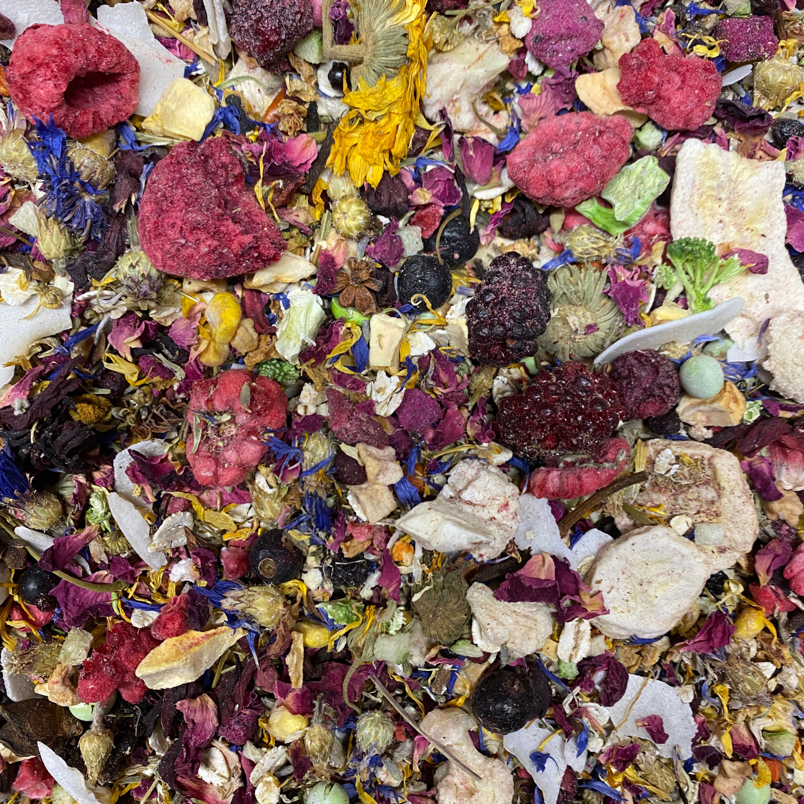 With our brand new 1kg Mikey and Mia Dry Mix, you receive 1kg of pure dry mix, absolutely no seeds! This bag of nothing but freeze-dried fruits and veg, herbs, spices and flowers is nearly identical to the original Dry Mix blends we offer, just no seeds and in a much larger and longer lasting quantity.