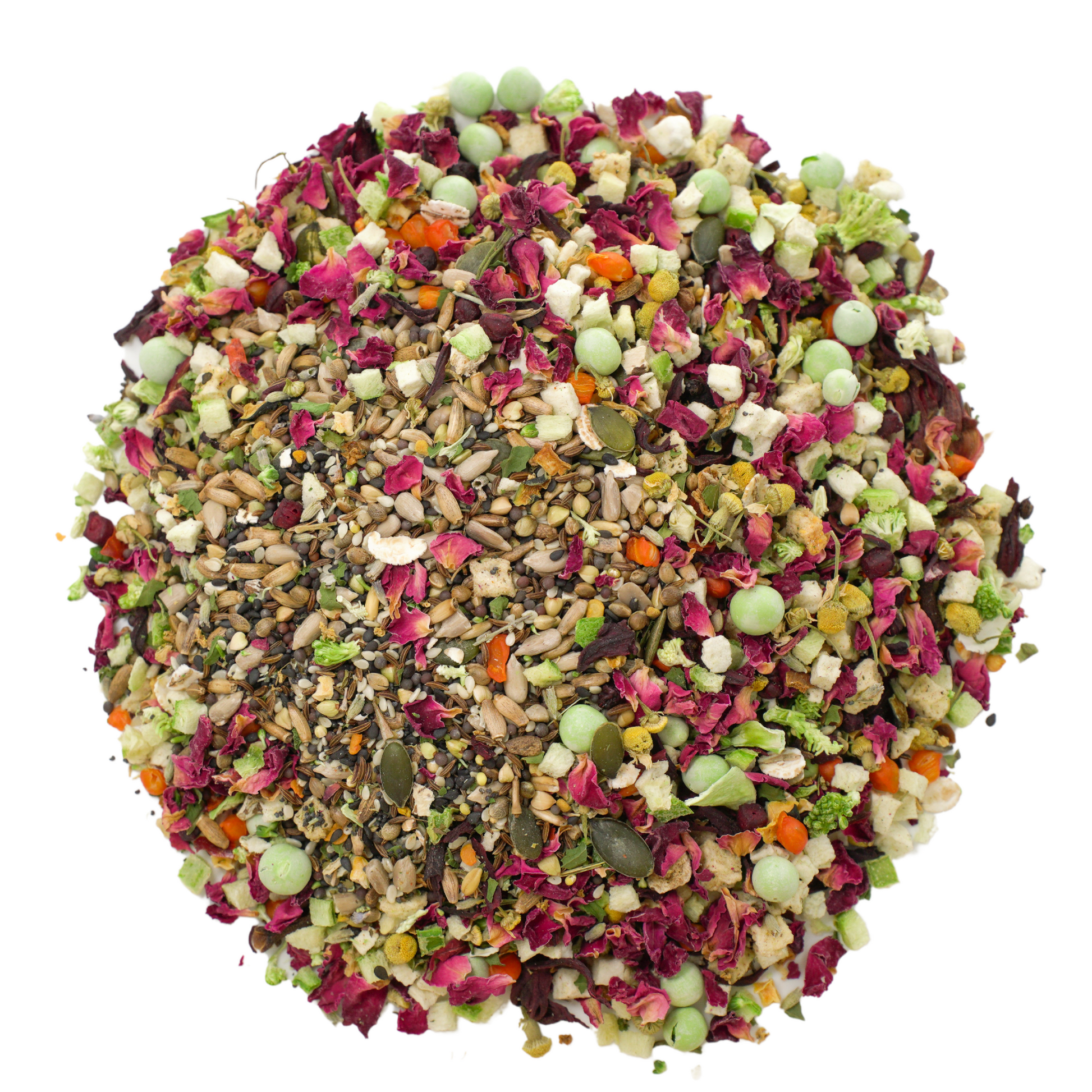 All of our fruit and vegetable ingredients are freeze dried for over 98% nutrient retention and this also allows the product to last much longer than fresh ingredients. The mixture of fruit, vegetables, flowers, herbs, spices and seeds means that your pet bird is getting a wide range of vitamins, minerals, proteins and healthy fats, whilst also engaging in an exciting foraging experience as they explore their bowl.