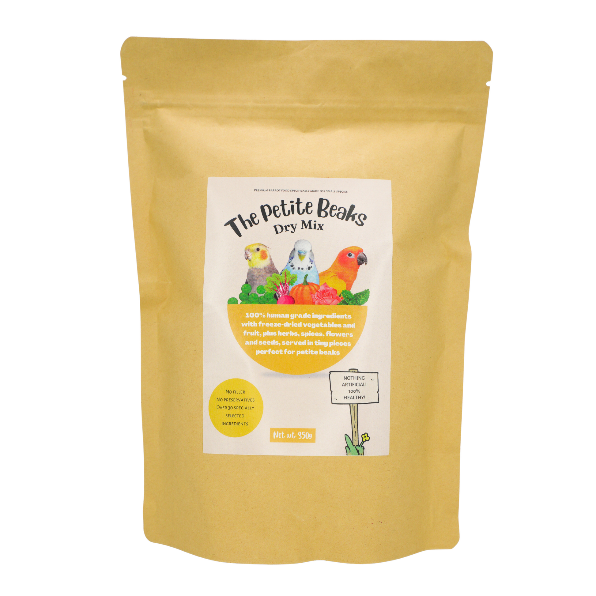 All of our dry mixes are suitable for all sized parrots and hookbills, however the Petite Beaks Dry Mix has been lovingly formulated with mini ingredients for tiny beaks and feets.